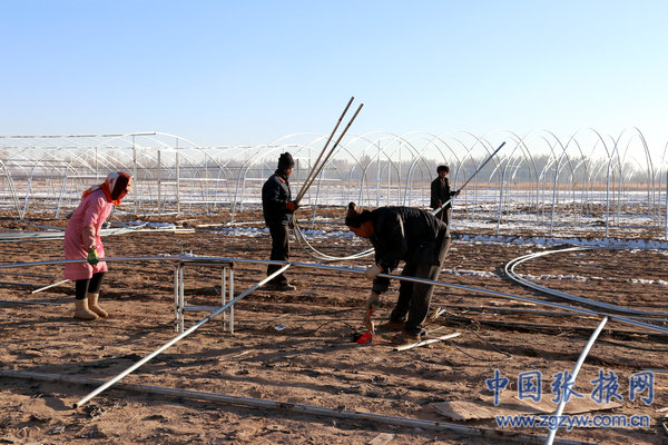 中國張掖網臨澤訊 寒冬時節,地凍農閑,但在臨澤縣蓼泉鎮唐灣村隴園春蔬菜農民專業合作社鋼架拱棚建設現場卻是一派熱火朝天忙生產的繁忙景象,農戶們忙著彎鋼管、搭架、固定鋼架拱棚,新建的鋼屋架大棚星羅棋布……這是該鎮冬季農業生產的一個縮影。