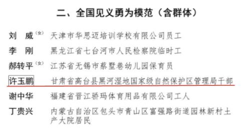 2011年12月,許玉鵬退伍,次年12月被分配到高臺縣黑河濕地國家級自然保護區管理局工作。在單位,許玉鵬嚴格遵守各項規章制度,保持嚴謹認真的工作態度和一絲不茍的工作作風,始終奔波在保護區的角角落落,從檢查維修管道到灌溉施肥,從整地保墑到苗木移栽,從病蟲害防治到疏松除草,保護區不少地方留下了他的身影……