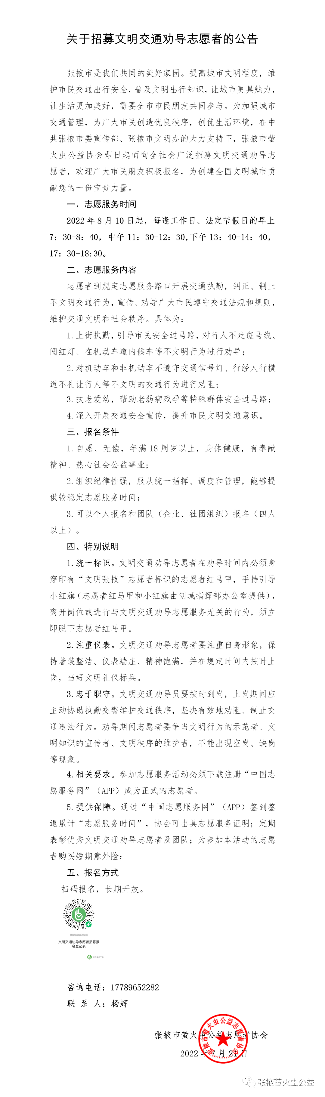 張掖是我們共同的美好家園。提高城市文明程度,維護(hù)市民交通出行安全,普及文明出行知識(shí),讓城市更具魅力,讓生活更加美好,需要全市市民朋友共同參與。為加強(qiáng)城市交通管理,為廣大市民創(chuàng)造優(yōu)良秩序,創(chuàng)優(yōu)生活環(huán)境,在中共張掖市委宣傳部、張掖市文明辦的大力支持下,張掖市螢火蟲公益協(xié)會(huì)即日起面向全社會(huì)廣泛招募文明交通勸導(dǎo)志愿者,歡迎廣大市民朋友積極報(bào)名,為創(chuàng)建全國文明城市貢獻(xiàn)您的一份寶貴力量。