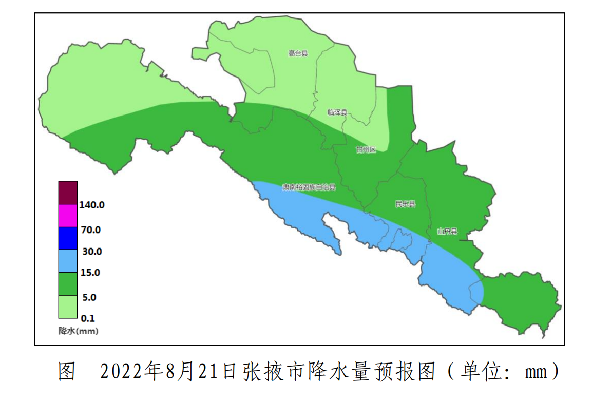 預計8月21—24日我市有持續性降水天氣過程。其中21日甘州、高臺、臨澤小到中雨,山丹、民樂、肅南中到大雨,降水量3-15mm ;22日高臺、臨澤中到大雨,民樂、肅南大雨,甘州、山丹北部暴雨,發生小時雨量大于10mm的短時強降水可能性較大,降水量10-35mm;23日高臺、臨澤小雨,甘州、山丹、民樂中雨,肅南中到大雨,降水量2-15mm;24日高臺、臨澤小到中雨,甘州、山丹、民樂、肅南中到大雨,降水量5-20mm。此次過程降水持續時間長,累計雨量大,降水疊加效應引發中小河流洪水和山洪地質災害氣象風險較高,請加強防范。