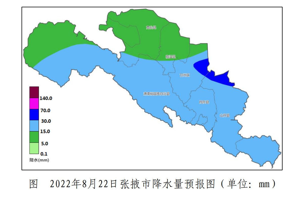 8月22日:高臺、臨澤中到大雨,民樂、肅南大雨,甘州、山丹北部暴雨,西北風4-5級;氣溫:川區16℃~22℃,山區12℃~16℃。