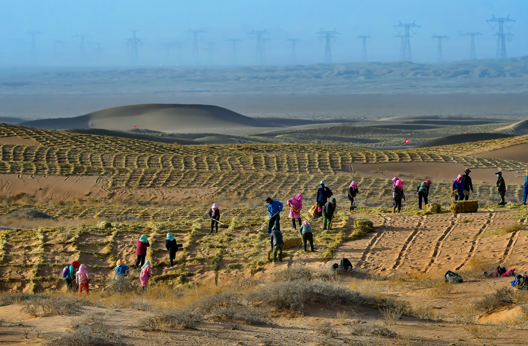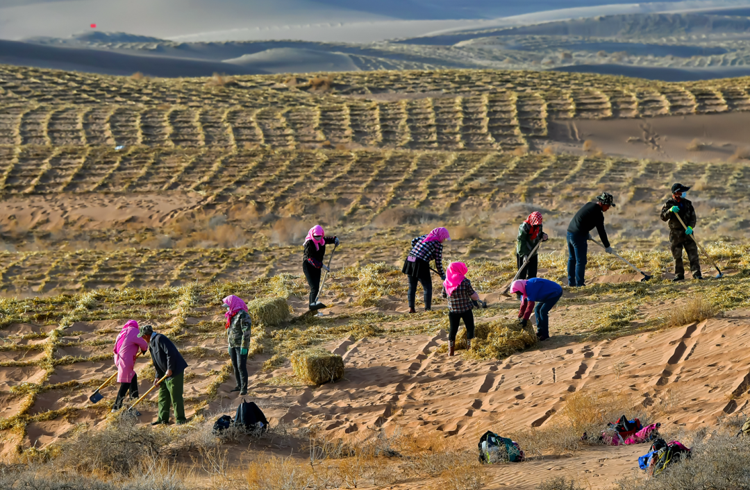 多年來,臨澤縣廣大干部群眾多措并舉、科學治沙,通過自然恢復和人工治理,生物治沙和工程治沙相結合的治理模式,持續開展防沙治沙,筑牢生態安全屏障,在境內39萬畝的沙漠上實施壓沙工程、種植梭梭。歷經幾十年的艱苦奮斗,初步形成了內有農田防護林網、中有防風固沙林帶、外有天然植被封育區的綠洲生態防護林體系。