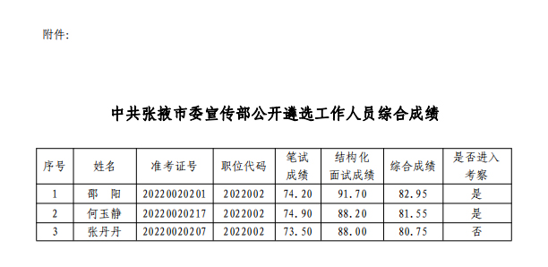 關于公布中共張掖市委宣傳部公開遴選工作人員綜合成績的公告