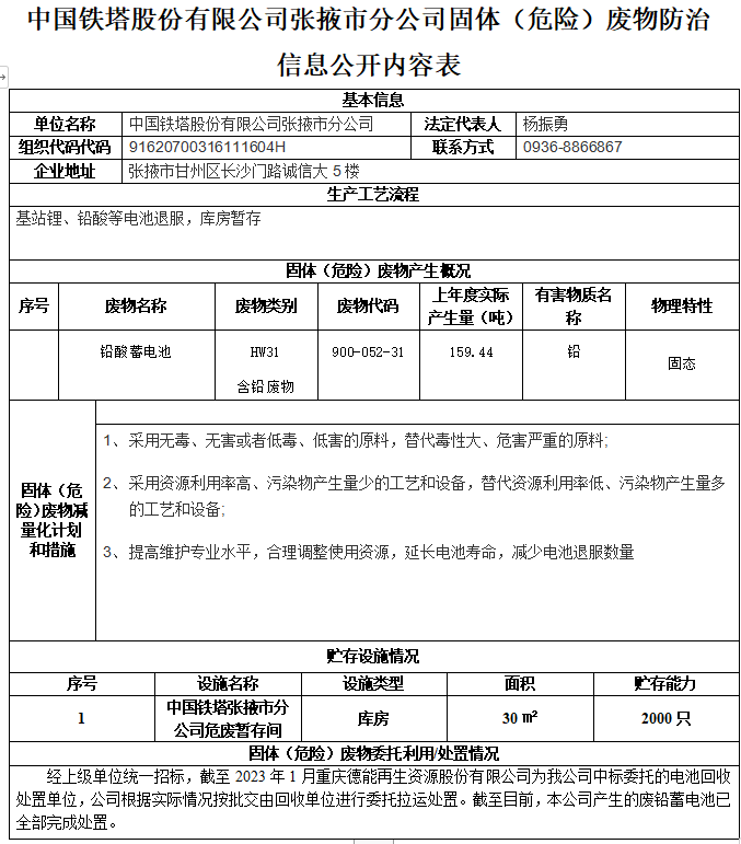 中國鐵塔股份有限公司張掖市分公司固體(危險(xiǎn))廢物防治 信息公開內(nèi)容表