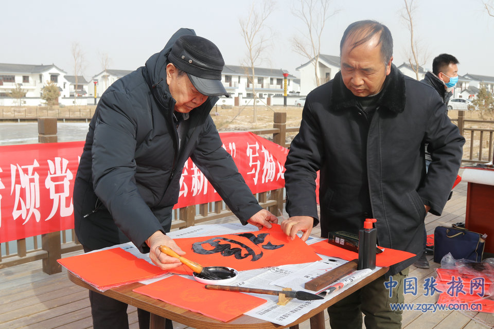 在熱鬧的戲曲表演旁,彩蝶灣社區(qū)昇龍?zhí)肚逅脚_也是熱鬧非凡。文聯(lián)的書畫老師們在這里揮毫潑墨,為百姓送上美好的祝福,歡快的太平鼓也早早拉開了農(nóng)歷新年的序幕,讓老百姓伴著這喜氣洋洋的鄉(xiāng)村鼓點迎新年。