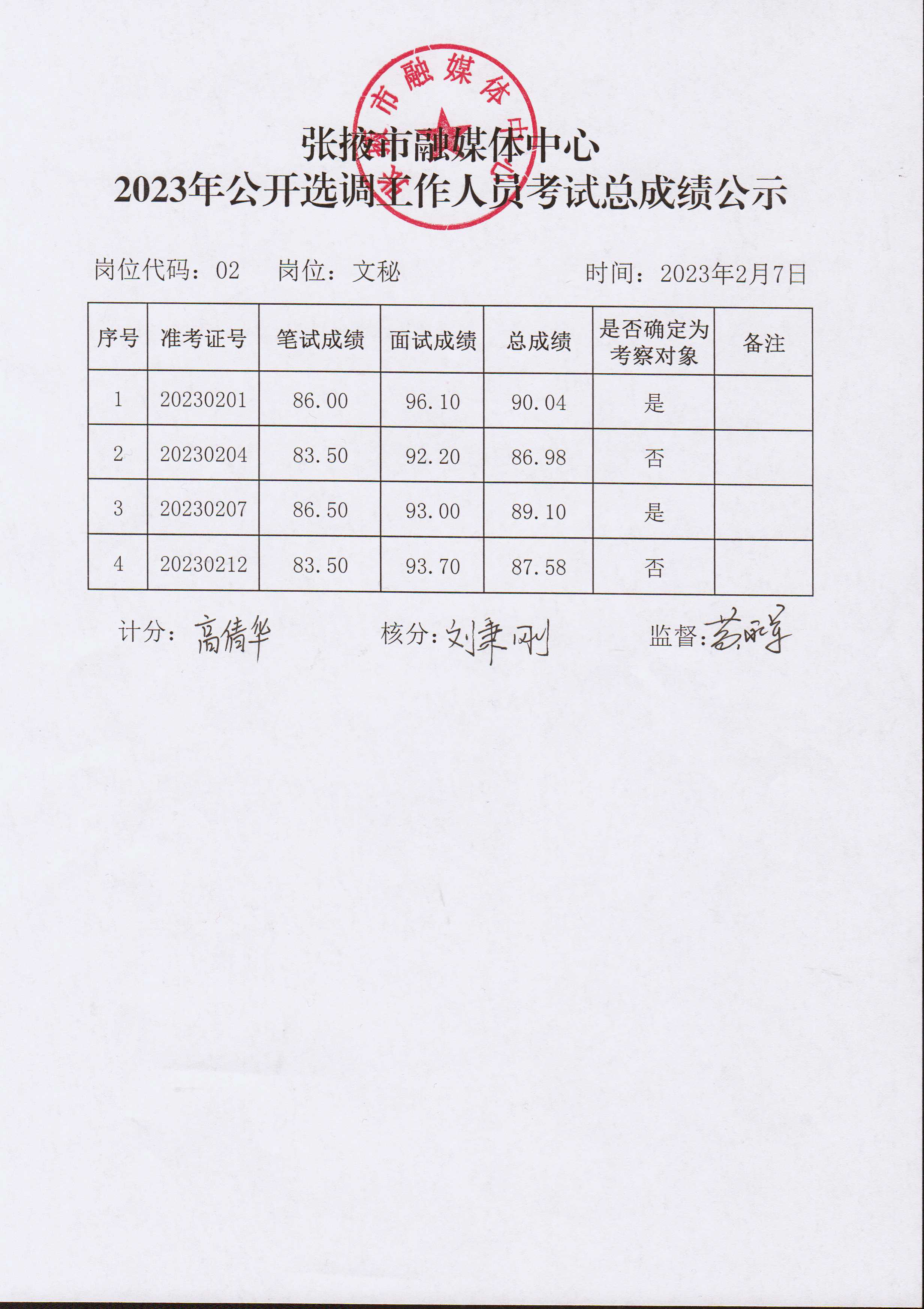 張掖市融媒體中心2023年公開選調工作人員面試成績公示