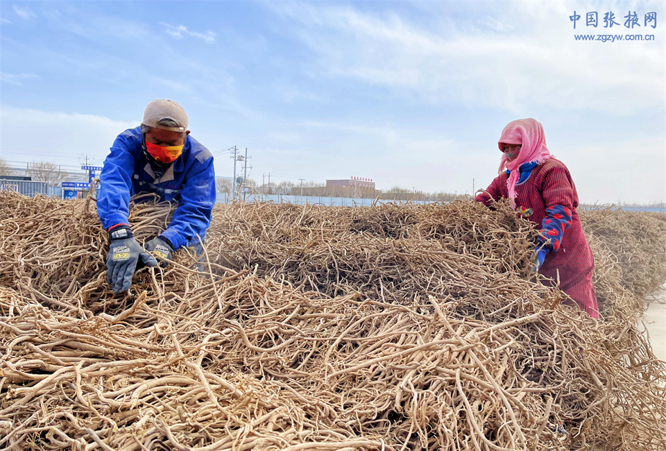 在民樂縣隴瑞藥業投資有限責任公司中藥材切片加工廠內,小山一般的中藥材堆滿了整個晾曬場,工人們正在車間內抓緊時間分揀黃芩。經過一系列加工程序,一片片大小一致、形狀規整的黃芩切片便完成了。