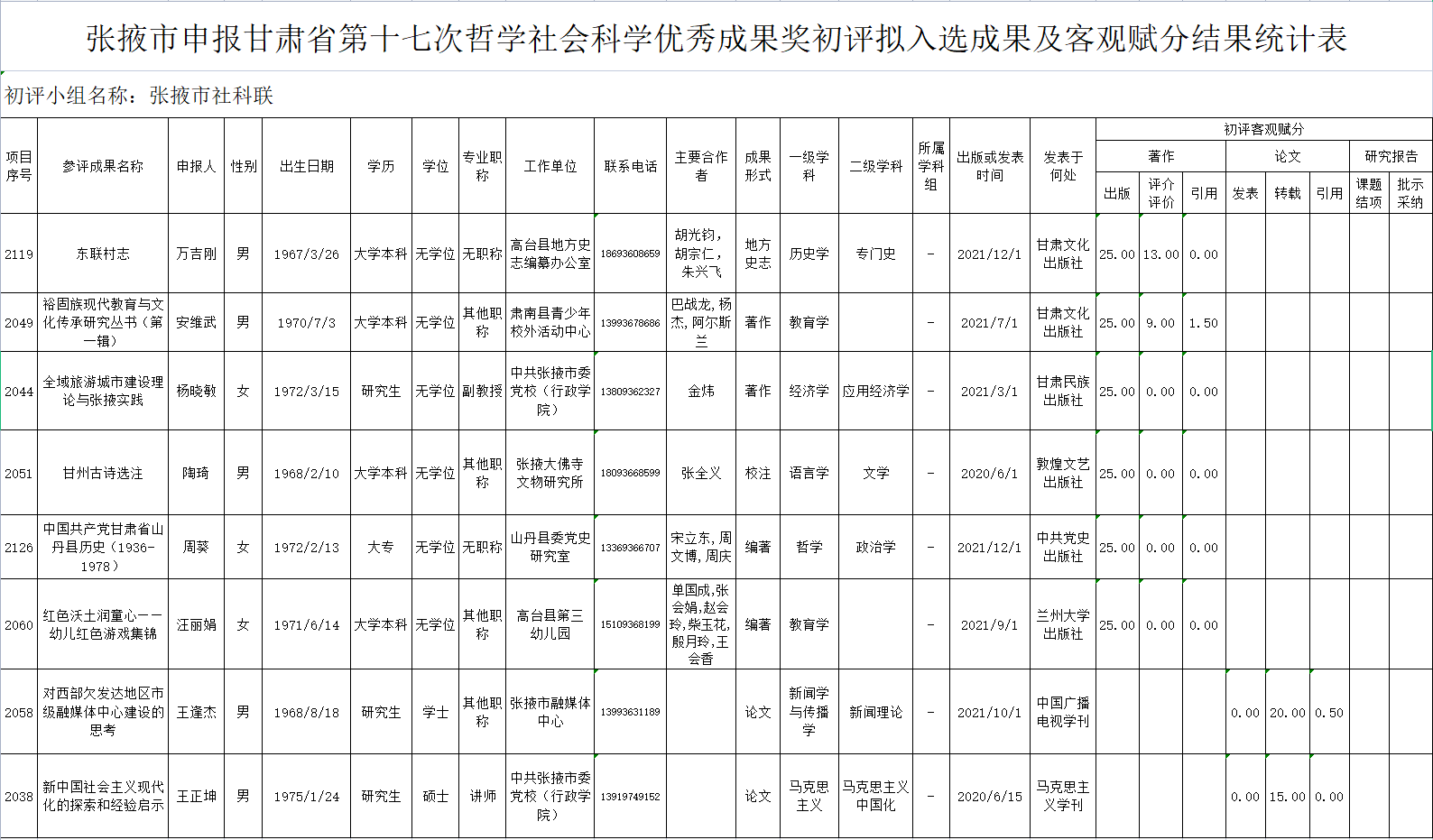 關(guān)于對張掖市申報(bào)甘肅省第十七次哲學(xué)社會(huì)科學(xué)優(yōu)秀成果獎(jiǎng)初評擬入選成果及客觀賦分結(jié)果進(jìn)行公示的公告