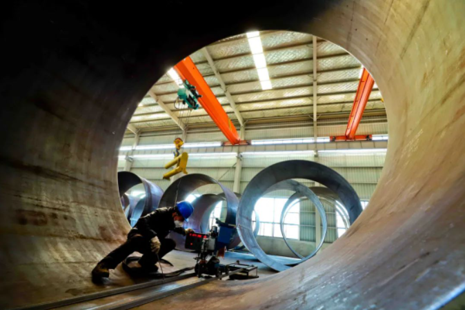 在該基地塔筒制造車間內(nèi),記者看到到隨著機(jī)器作業(yè),一塊塊鐵板被圈成圓筒,隨后經(jīng)過縱縫、組對、環(huán)縫、捍傷、防腐、內(nèi)附件安裝等環(huán)節(jié)后,一個個外表上噴有“中船風(fēng)電”藍(lán)色字樣的塔筒便呈現(xiàn)在眼前。