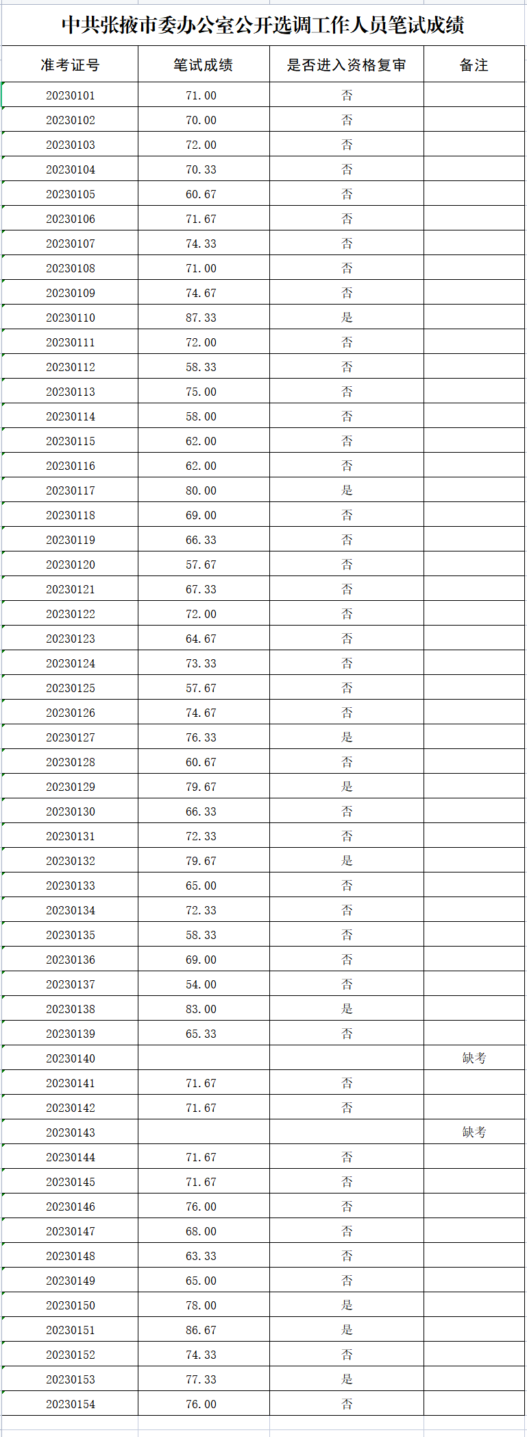 現將中共張掖市委辦公室下屬事業單位(張掖市會議接待服務中心)公開選調工作人員筆試成績及資格復審有關事宜進行公布。請進入資格復審的考生嚴格按照《中共張掖市委辦公室公開選調工作人員公告》中相關要求,準備齊全所需材料,于2023年5月23日上午8:30-12:00、下午2:30-6:00到市委、市政府統辦1號樓913室進行資格復審。未在規定時間內完成資格復審的視為放棄選調資格。資格復審不合格或放棄選調資格的將按筆試成績從高到低的順序依次遞補確定面試人員。面試事宜另行公告。