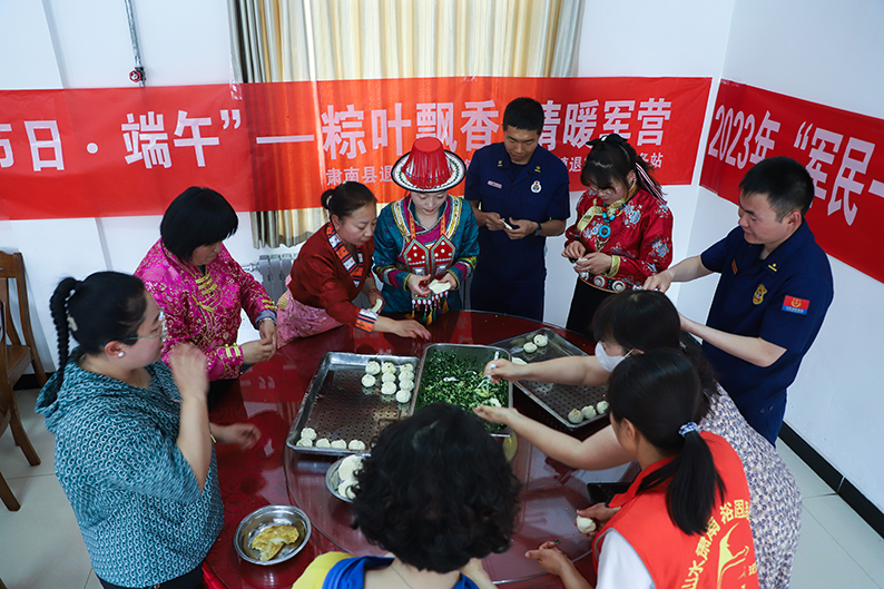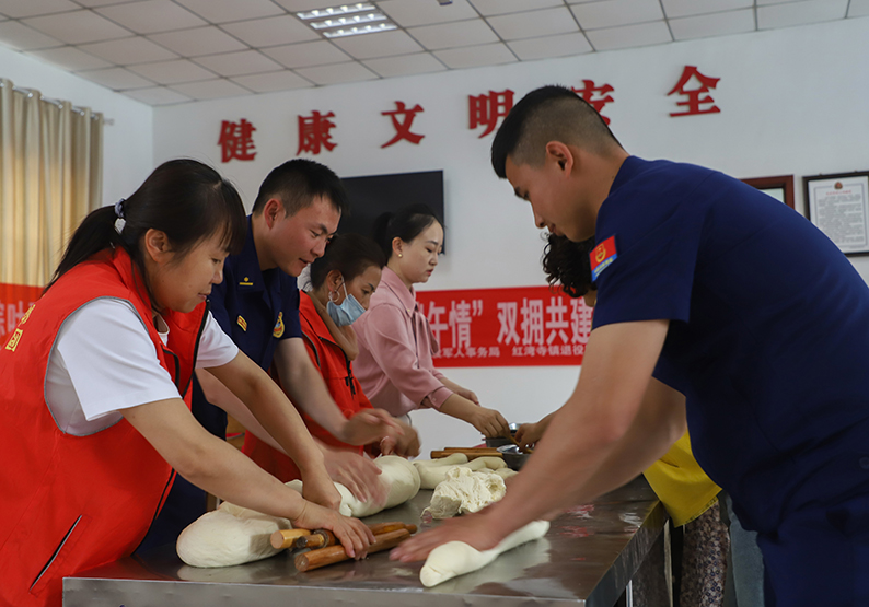 中國張掖網肅南訊 6月20日,肅南縣雙擁辦、縣退役軍人事務局組織紅灣寺鎮“兵媽媽”志愿者服務隊赴縣森林消防大隊開展“粽葉飄香情暖消防”“軍民一家親 濃濃端午情”主題活動,為消防指戰員送去節日問候。