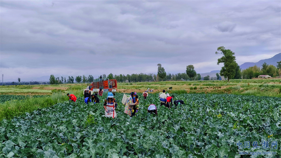 中國張掖網甘州訊  夏風吹、熱浪起,又到了收獲的季節。近日,甘州區花寨鄉西蘭花種植基地里,綠油油的西蘭花迎來豐收季,村民們三五成群忙著采摘、裝袋、搬運,忙碌的身影和綠色的菜地組成一幅鄉村振興的美麗畫卷。