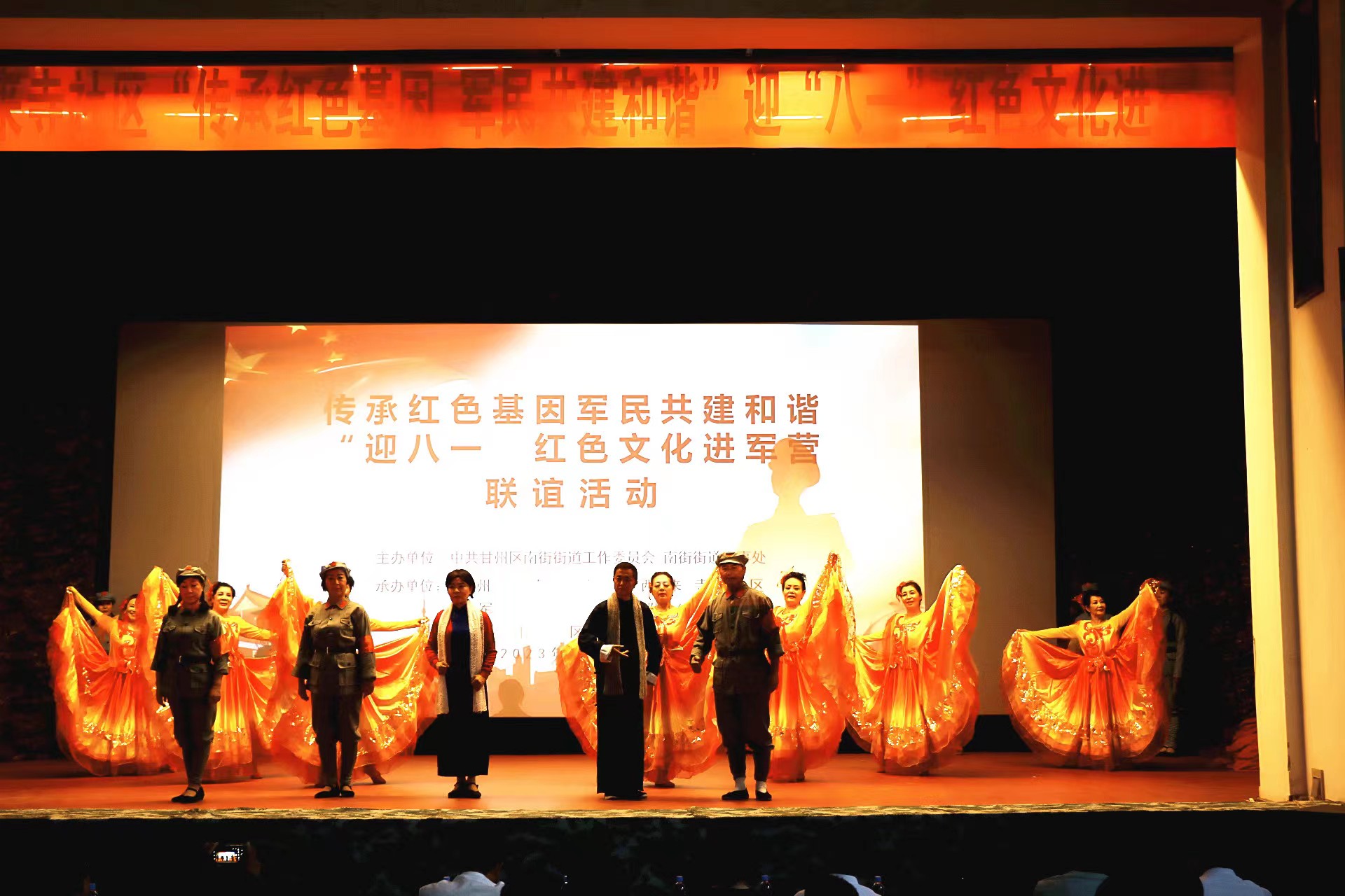 由社區銀齡先鋒志愿者帶來的紅色經典情景劇《我們萬眾一心》拉開了晚會序幕,將臺下的官兵和觀眾帶進了黨的百年光輝的歷程,解放軍戰士表演的節目節目彰顯出軍人的風采,讓臺下的觀眾一睹了錚錚鐵骨、氣度不凡的軍人氣魄,大學生表演的小合唱《祖國不會忘記》喚起了青春的朝氣,請黨放心強國有我,紅色故事《為了新中國前進》彰顯了英雄為了國家、為了人民粉身碎骨視死如歸的精神。《白發親娘》《裕固歡歌》等舞蹈展現了社區居民的文明風范,演員們精彩的表演,贏得了現場觀眾叫好連連,現場洋溢著歡快、熱烈、喜氣洋洋、積極向上的氣氛。充分體現了軍愛民,民擁軍所取得的成果,展示了軍民魚水一家親,攜手共建和諧的美好場景。演出結束后,社區為部隊官兵贈送了《甘州紅故事》《紅西路軍征戰河西史》等紅色故事書籍,甘州區圖書館也向解放軍指戰員贈送了書畫作品。