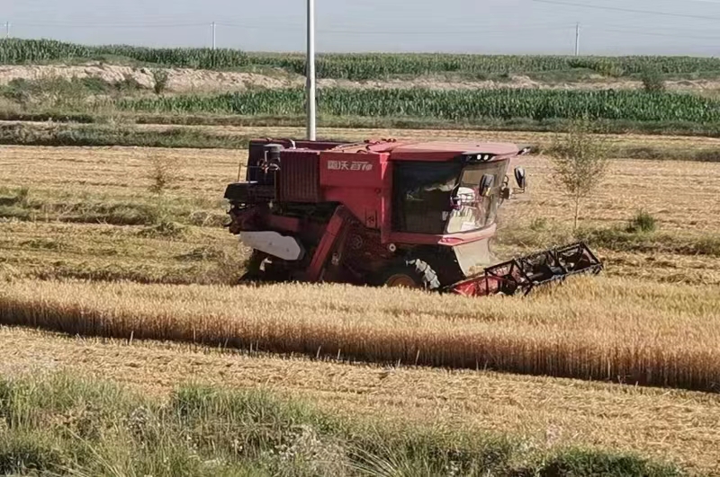 中國張掖網甘州訊 近日,甘州區安陽鄉的高標準農田里,數臺收割機正在緊張忙碌著。一望無際的麥田,黃澄澄的麥粒顆粒飽滿陸續成熟,全鄉種糧戶搶抓晴天忙收割,確保糧食顆粒歸倉。