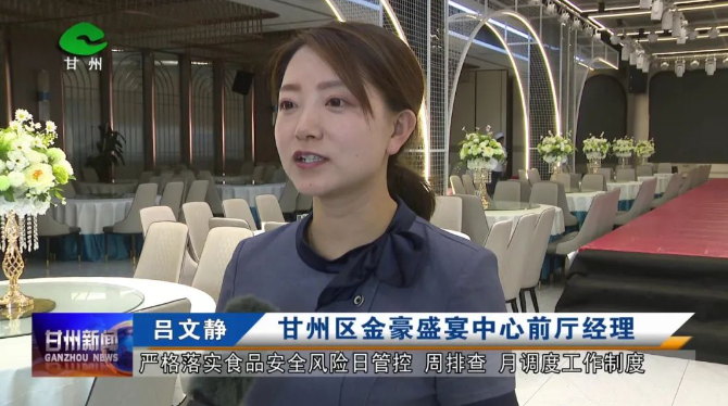 記者在甘州區(qū)金豪盛宴中心看到,店內(nèi)的餐具、器皿、桌布、椅套等擺放有序,食品安全標(biāo)語標(biāo)牌隨處可見。