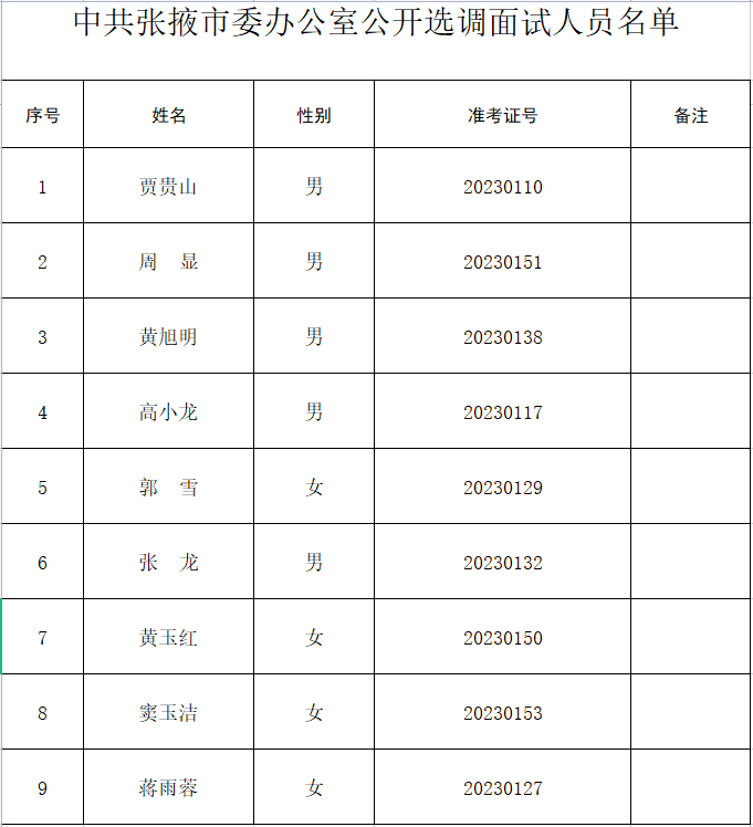 中共張掖市委辦公室下屬事業(yè)單位(張掖市會(huì)議接待服務(wù)中心)公開選調(diào)工作人員資格復(fù)審環(huán)節(jié)工作已結(jié)束,根據(jù)《中共張掖市委辦公室公開選調(diào)工作人員公告》有關(guān)規(guī)定,現(xiàn)將面試人員名單予以公布。請(qǐng)考生保持通訊工具暢通,于2023年9月8日14:30-18:00到市委市政府統(tǒng)辦1號(hào)樓812室領(lǐng)取面試通知書,具體面試時(shí)間、地點(diǎn)及有關(guān)注意事項(xiàng)以面試通知書為準(zhǔn)。未在規(guī)定時(shí)間內(nèi)領(lǐng)取的視為放棄選調(diào)資格。