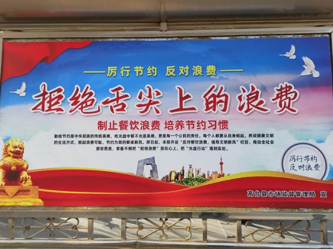 強化宣傳引導,營造文明餐桌風尚。充分利用“3·15”國際消費者權益日、食品安全宣傳周、環境保護日等契機,在濕地新區主干道制作宣傳展板,印制《反食品浪費法》宣傳畫冊5000份,向群眾普及勤儉節約,宣傳浪費糧食的嚴重性及厲行勤儉節約的必要性,倡導自覺踐行“光盤”行動,堅決抵制“舌尖上的浪費”,舉辦“倡導文明餐桌,制止餐浪費”倡議活動5場次,簽訂《創建國家食品安全示范城市誠信經營承諾書》700余份,推廣文明餐桌禮儀,爭做“文明餐桌”行動的踐行者,餐飲服務單位經營場所張貼“厲行節約,反對浪費”等宣傳標語海報5000余張,讓文明餐桌理念貫穿餐飲服務全過程,推動制止餐飲浪費取得實效。充分利用微信、QQ、釘釘群等向廣大群眾和餐飲服務單位廣泛宣傳《厲行節約反食品浪費倡議書》,依托縣融媒體中心、高臺政務網、微信公眾號以及電子顯示屏等向市民常態化宣傳綠色消費、文明用餐理念,營造了社會廣泛關注、群眾參與其中、人人獲益其中的文明用餐的良好氛圍。