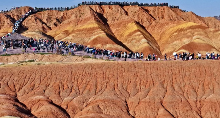 從晨曦微露到霞光夕映,七彩丹霞景區(qū)處處人頭攢動(dòng),游客隊(duì)伍猶如一條巨龍,蜿蜒向前。十一當(dāng)日,張掖七彩丹霞景區(qū)接待游客27055人次,成為“十一”假期首個(gè)“流量王”。