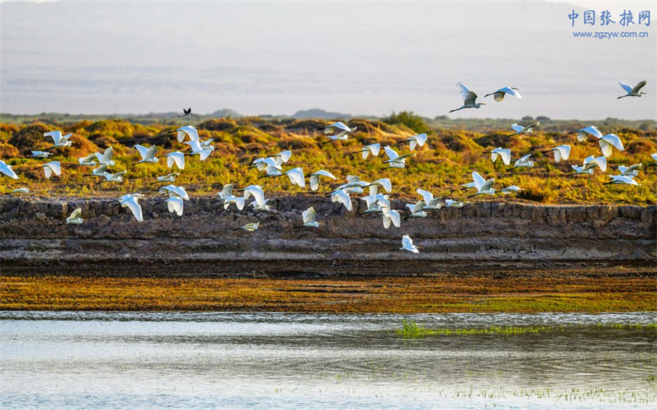 中國張掖網民樂訊 深秋,數批遷徙候鳥陸續集結在民樂縣雙樹寺水庫、翟寨子水庫、濕地水域“做客”。數百只珍稀水鳥將濕地變為樂園,時而展翅飛翔、時而覓食戲水……呈現出一幅風光旖旎、生機盎然的生態美景。