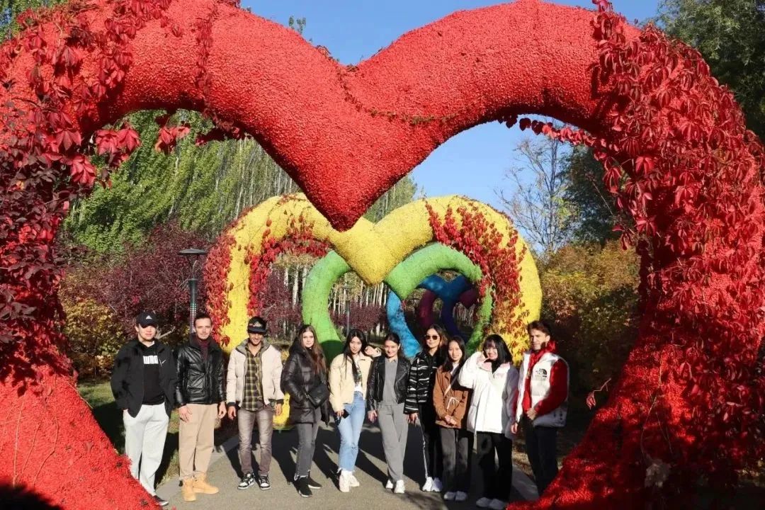 金秋時節(jié),研學(xué)團(tuán)青年留學(xué)生們漫步在張掖蘆水灣旅游度假區(qū),樹木蔥郁,波濤微瀾,萬壽菊、馬鞭草、百日草等各色花卉競相綻放,蜿蜒的步道上游客漫步休閑,湖水澄明如鏡,水鳥在蘆葦叢旁翩躚嬉戲,與遠(yuǎn)處巍峨的祁連群峰相映成趣,構(gòu)成了一幅美麗的生態(tài)畫卷。