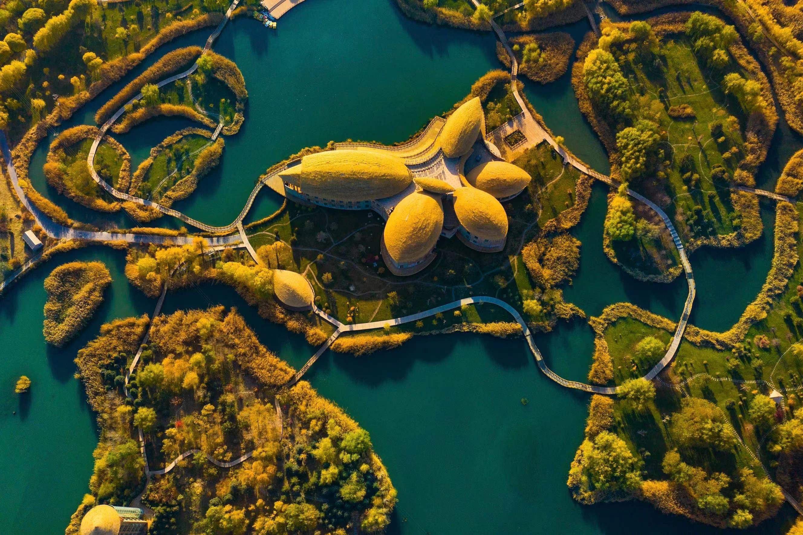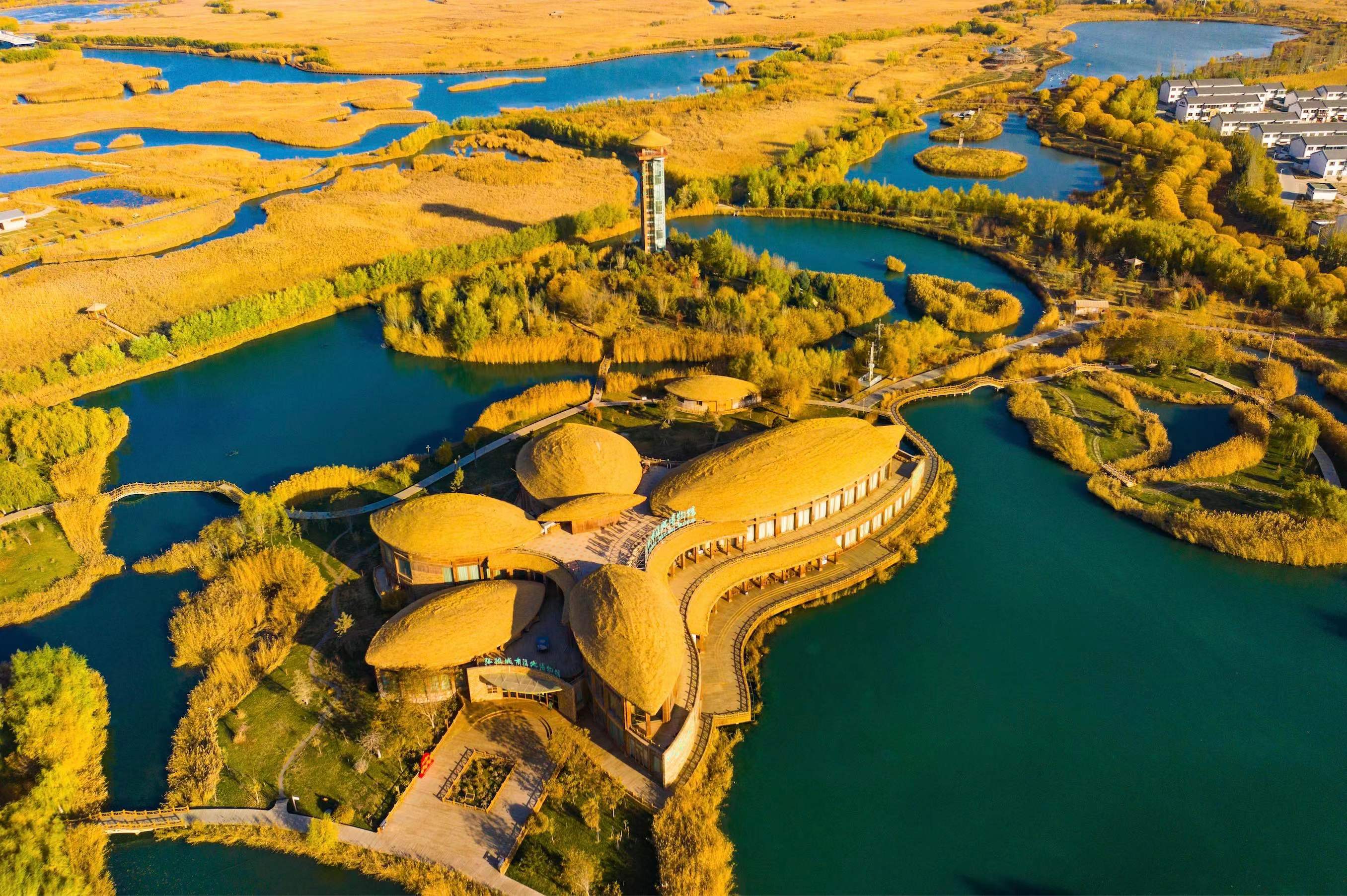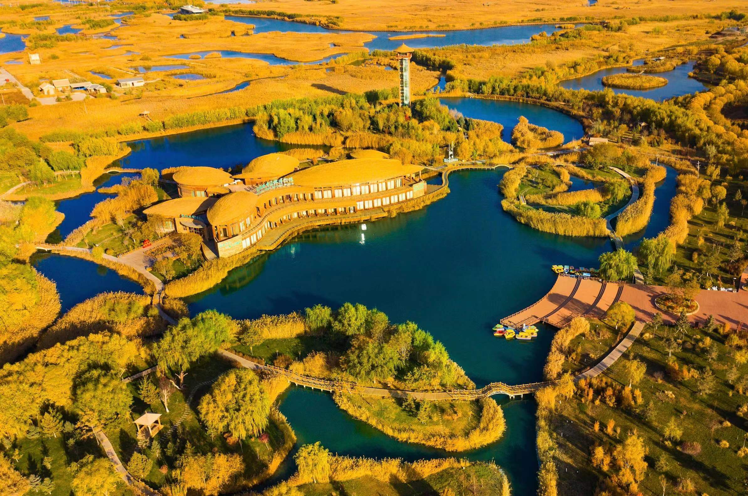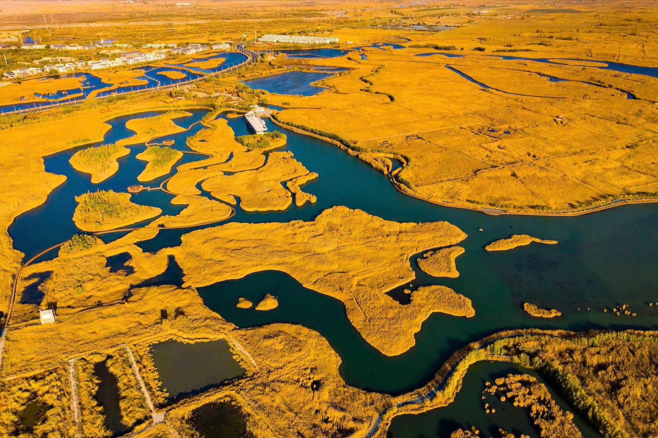 中國張掖網訊 金秋十月,張掖國家濕地公園萬畝蘆葦一片金黃,從高空俯瞰,葦草綿綿,秋水盈盈,美不勝收。(巨興奮 吳瑋)