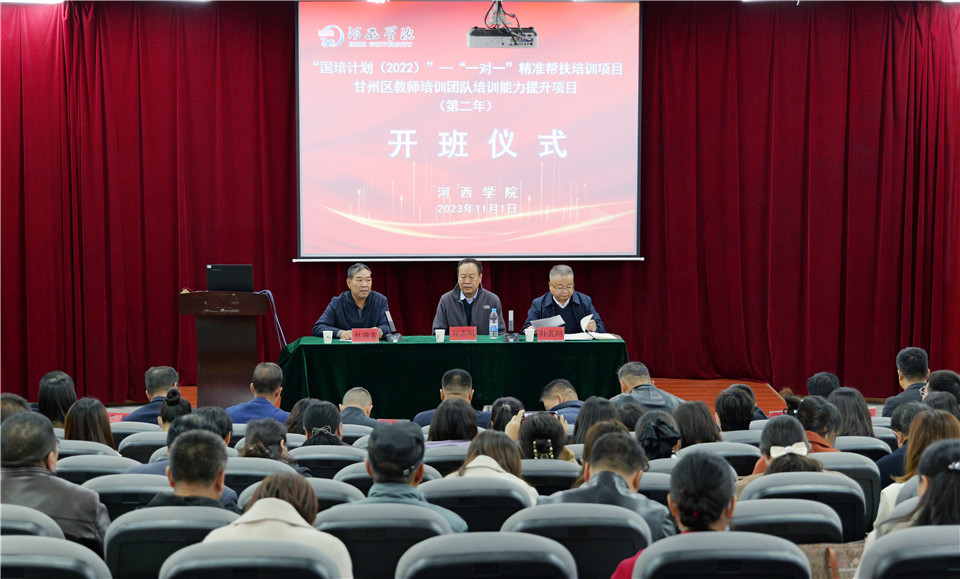 中國張掖網訊 11月1日,河西學院承擔的“國培計劃(2022)” “一對一”精準幫扶培訓項目甘州區(qū)教師培訓團隊培訓能力提升項目(第二年)培訓班開班。蘭州市教育科學研究院、河西學院繼續(xù)教育學院負責人、學科指導負責人、甘州區(qū)幫扶中小學幼兒園項目負責人、班主任和培訓學員共120人參加了開班儀式。