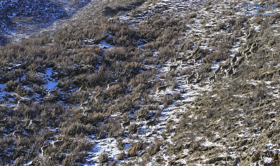 中國張掖網民樂訊 11月16日,張掖市民樂縣公安局森林警察大隊民警在海拔2800米的扁都口林區利用無人機巡護時,拍到一大群巖羊在雪地覓食、奔跑的珍貴畫面。數量達200只左右,場景壯觀。