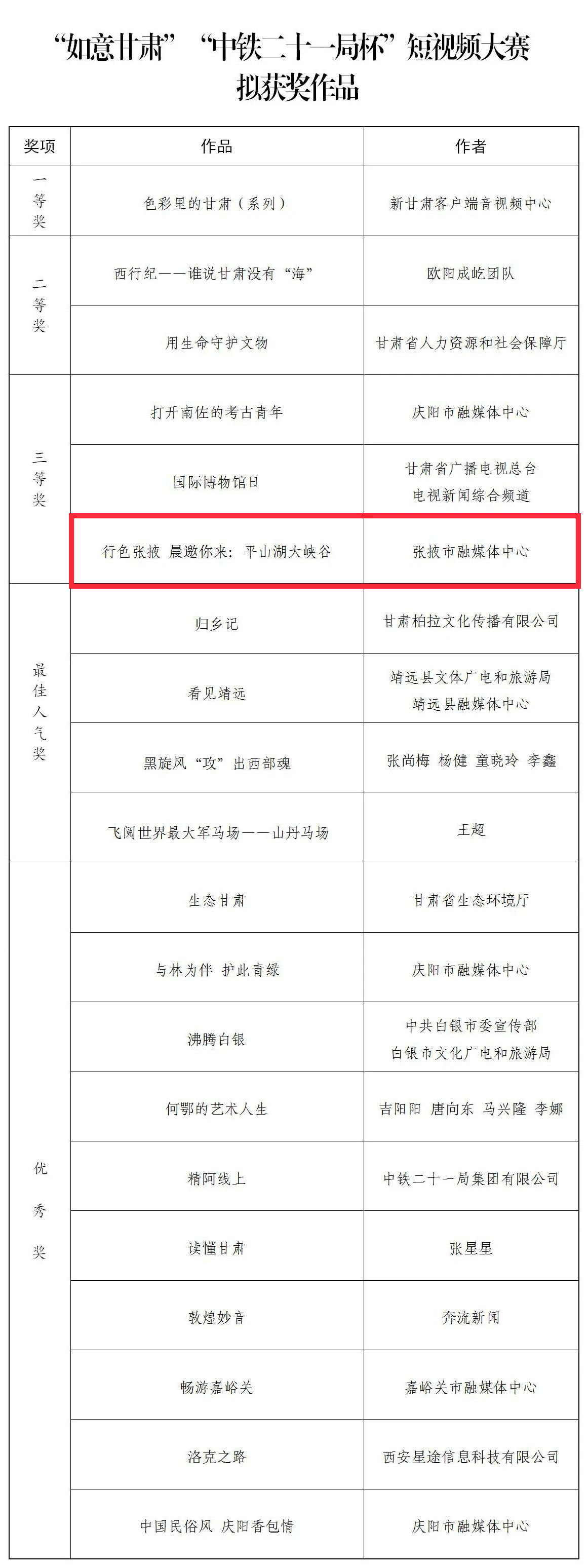 根據《中共甘肅省委宣傳部關于舉辦“如意甘肅”“中鐵二十一局杯”短視頻大賽的通知》精神及相關評審方案,經初審、初評、聯評和評審委員會研究,擬確定《色彩里的甘肅(系列)》等20部作品為本次大賽獲獎作品。由張掖市融媒體中心攝制的短視頻《行色張掖晨邀你來——平山湖大峽谷》入選。