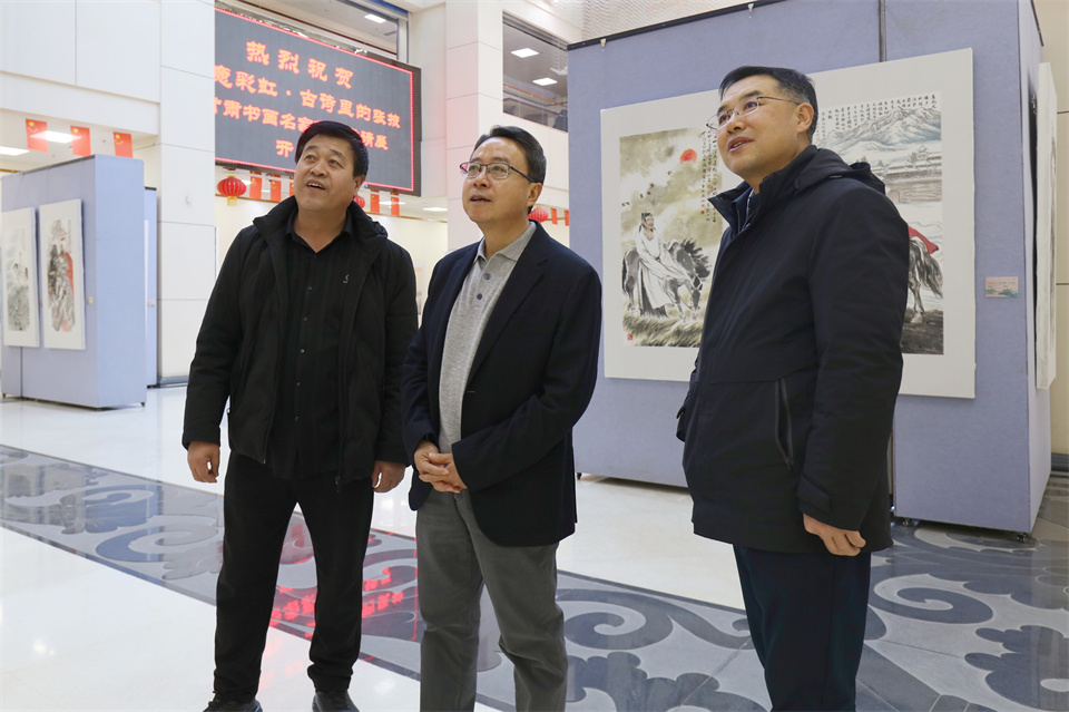 1月5日,張掖市委書記盧小亨參觀詩意彩虹·古詩里的張掖——甘肅書畫名家作品邀請展。市領導喬振華、尚友俊一同觀展。