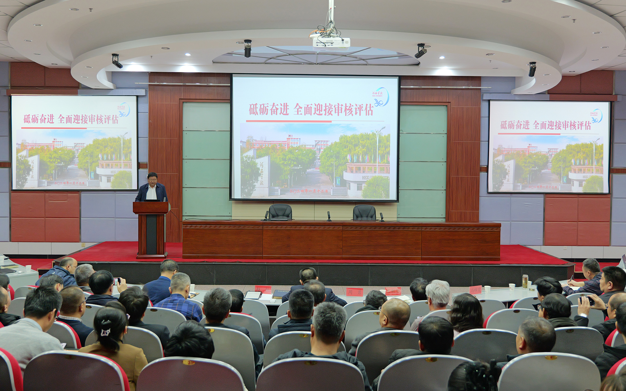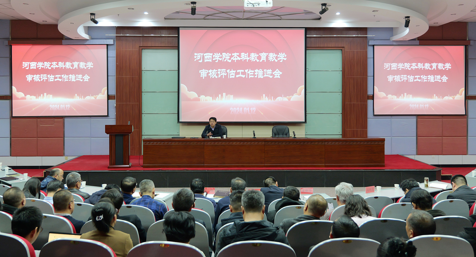 中國張掖網訊 1月12日上午,河西學院召開本科教育教學審核評估工作推進會。黨委副書記、校長周勇,黨委常委、副校長趙柱,黨委常委、副校長王新華出席會議。各職能部門負責人、二級學院科級以上干部以及教研室主任200余人參加了會議。會議由校長周勇教授主持。