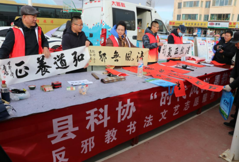 臨澤縣科協積極發揮科普大篷車展教作用到倪家營鎮開展“我為鄉親寫春聯”送春聯下基層活動,突出崇尚科學,反對邪教,引領時代風尚,書寫墨韻清風的活動主題,積極引導廣大農民群眾相信科學、破除迷信、遠離邪教,自覺抵制邪教,增強預防和抵制邪教的能力,營造清風正氣的社會環境。