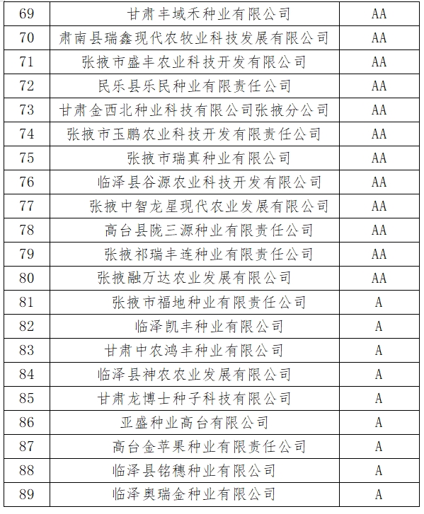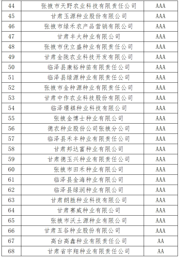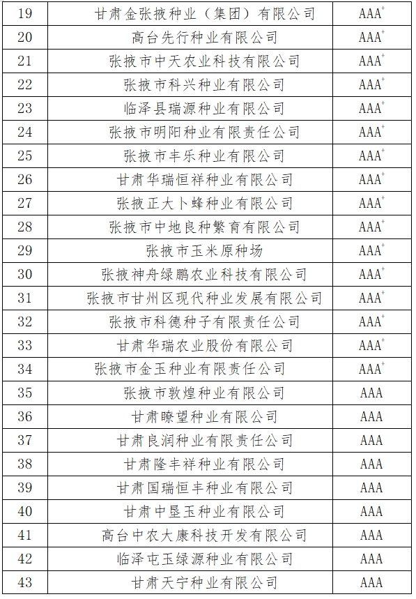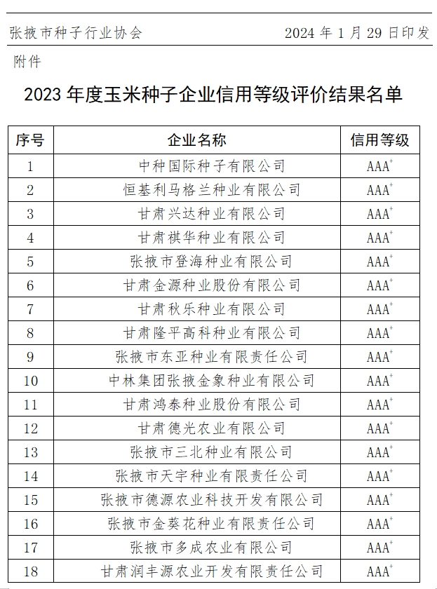 根據《張掖市種子行業協會關于下發2023年度玉米種子企業信用等級評價分值量化標準的通知》(張種協發〔2024〕1號)要求,市縣區種子行業協會和種子管理部門從企業基礎指標、管理指標、信用記錄指標、競爭力指標四個方面進行了公平、公正、公開的量化打分,經市種子行業協會審定,確定了企業信用等級。企業信用等級結果于2024年1月24日至1月26日在《張掖日報》進行了公示,現予以公布。