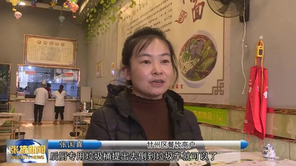 甘州區(qū)餐飲商戶張國喜:“我們的廚余垃圾現(xiàn)在都是通過門外面的垃圾車,后廚專用垃圾桶提出去倒到垃圾車就可以了,他們提供的這個服務讓我們特別的方便,而且后堂非常整潔干凈。”