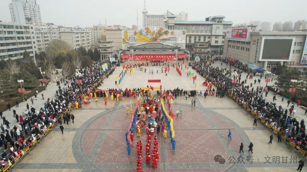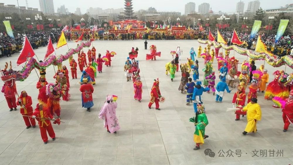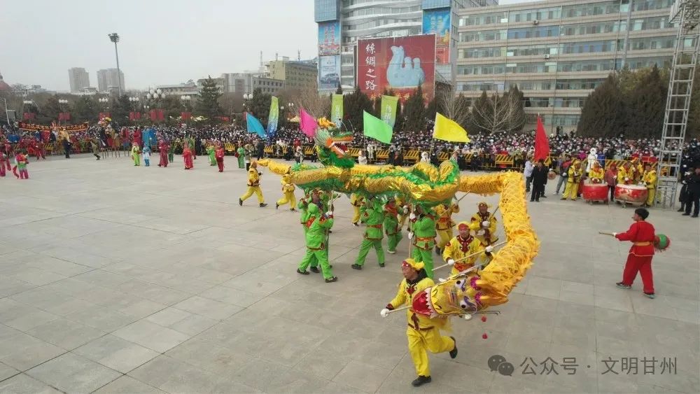 中午1時,天氣雖冷,但中心廣場鑼鼓震天,一支支社火隊華冠麗服、氣勢磅礴,騰龍舞獅,套路多變。整齊的陣容、旺盛的士氣,充分展示出甘州人民昂揚向上的朝氣,也將新春的熱鬧氛圍推向又一個高潮。