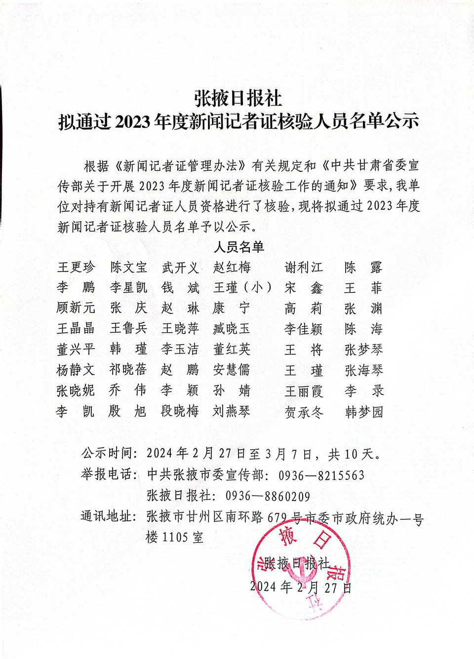 張掖日報社擬通過2023年度新聞記者證核驗人員名單公示