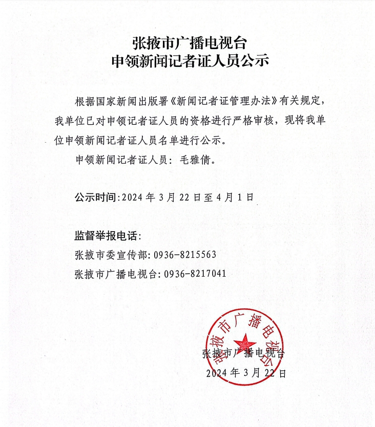 張掖日報社擬通過2023年度新聞記者證核驗人員名單公示