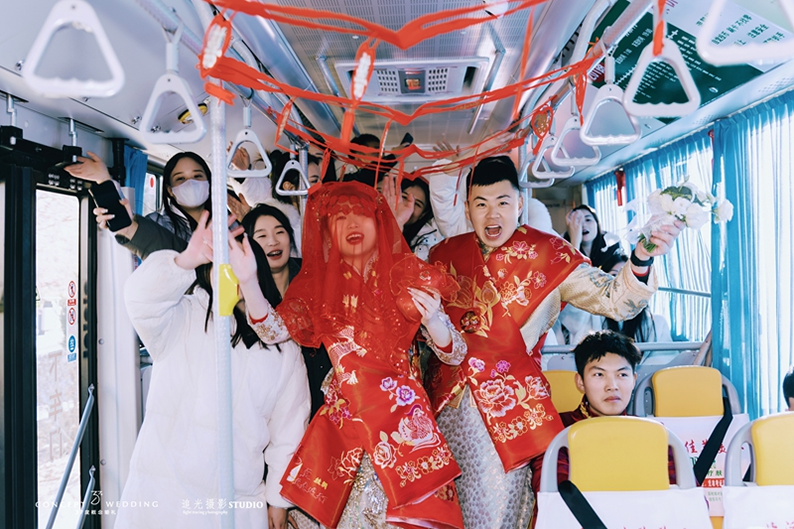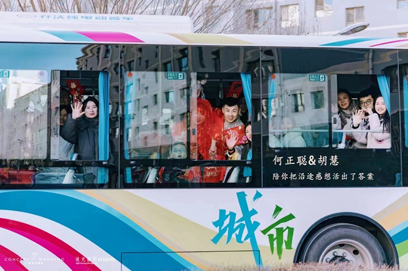 在迎親路上,大家一起唱歌、玩游戲,不時用手機定格美好瞬間,氣氛熱烈。“用公交車當婚車,這樣的婚禮方式簡約浪漫、經濟實惠,還彰顯了時尚與個性。”“和傳統婚禮比起來,這種方式更能讓家人朋友共享這段路途的喜悅。我們的結親之旅還收獲了過路行人的大聲祝福,婚禮氛圍太好了。”新郎何正聰、新娘胡慧幸福的說道。