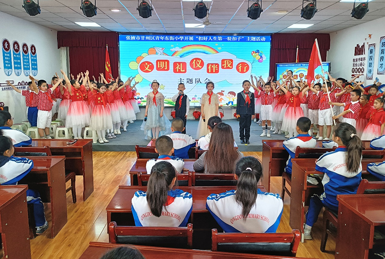 中國張掖網甘州訊 為提升學生文明禮儀行為意識和自覺,為創建全國文明城市貢獻力量,4月30日,甘州區青年東街小學少先大隊組織開展“文明禮儀伴我行”主題隊會。