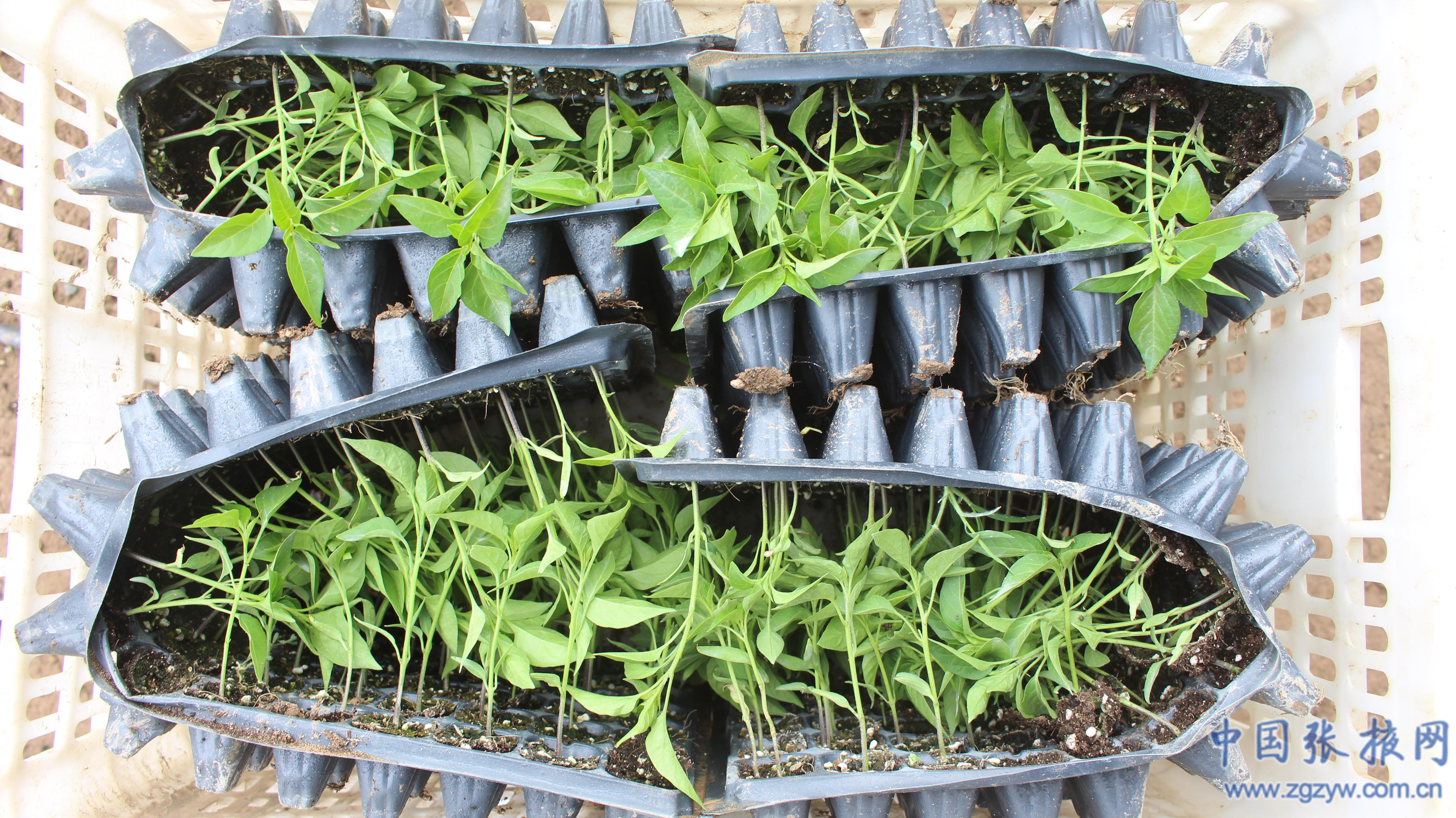 在辣椒種植基地,一筐筐綠油油的辣椒苗被運送到地頭,打孔、放苗、覆土……一道道工序有條不紊進行。