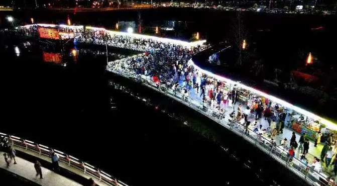 在夜市的熱鬧氛圍中,各類人群匯聚一堂。年輕的情侶手挽手漫步在人群中,不時地交談著,臉上洋溢著幸福的笑容。家長們帶著孩子穿梭在攤位間,品嘗著各種美食,享受著難得的親子時光。還有那些三五成群的年輕人,他們在皓月橋下,圍坐在攤位前,如同李白“舉杯邀月”般,與同伴暢飲,暢談人生理想。