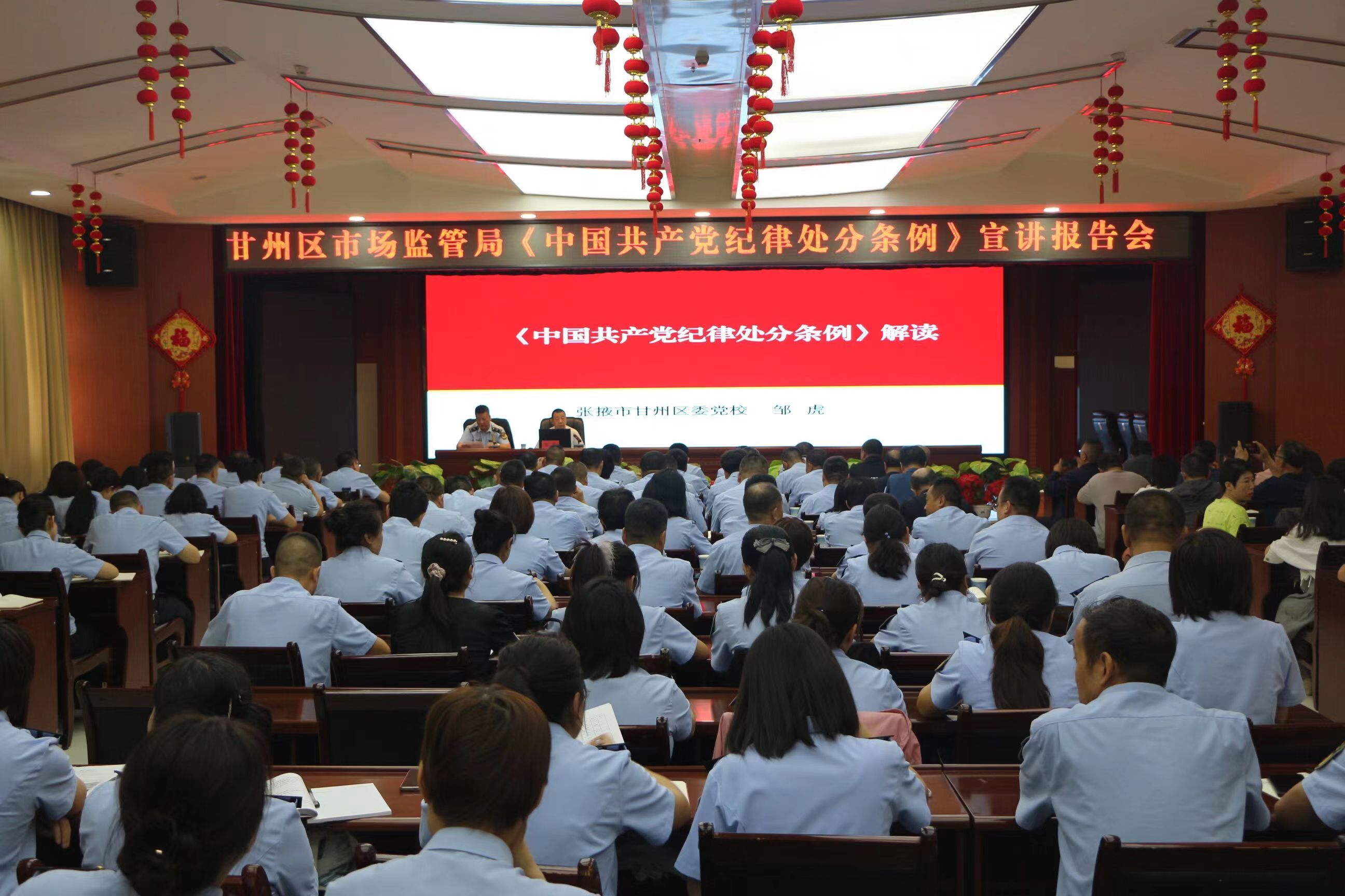 中國張掖網甘州訊 為引導廣大黨員干部進一步學紀、知紀、明紀、守紀,近日,甘州區市場監管局邀請區委黨校教授對《中國共產黨紀律處分條例》進行了專題宣講解讀。區發展改革局、區商務局、區稅務局、區工信局、區審計局領導干部及職工代表;市場監管局機關、各監管所干部職工,共計160余人參加了宣講報告會。