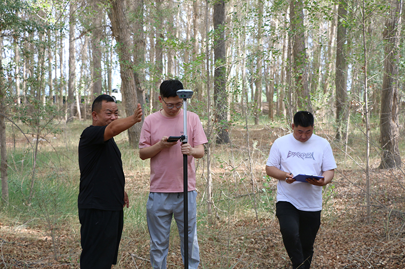勘測現場正在帶隊進行實地勘測的張掖市指南針測繪有限責任公司總經理許棟為了保證數據的精度,運用了多種手段,他說:“為了保證數據的精度,我們以航拍信息為依據,通過衛星定位、人工測繪等方式進行地籍勘測,查清承包地塊實際面積、四至邊界和空間位置,最終實現每塊土地都有一個數據準確的坐標?!弊鳛橥苿蛹w林權制度改革具體工作的一員,臨澤縣自然資源局干部閆天虎說:“2009年集體林權改革時,分林到戶的林地存在面積不準、地類重疊、界線不清等問題,通過深化集體林權制度改革,理清了以上歷史遺留問題,解決了林地就是林地,耕地就是耕地,草地就是草地的根本問題。”