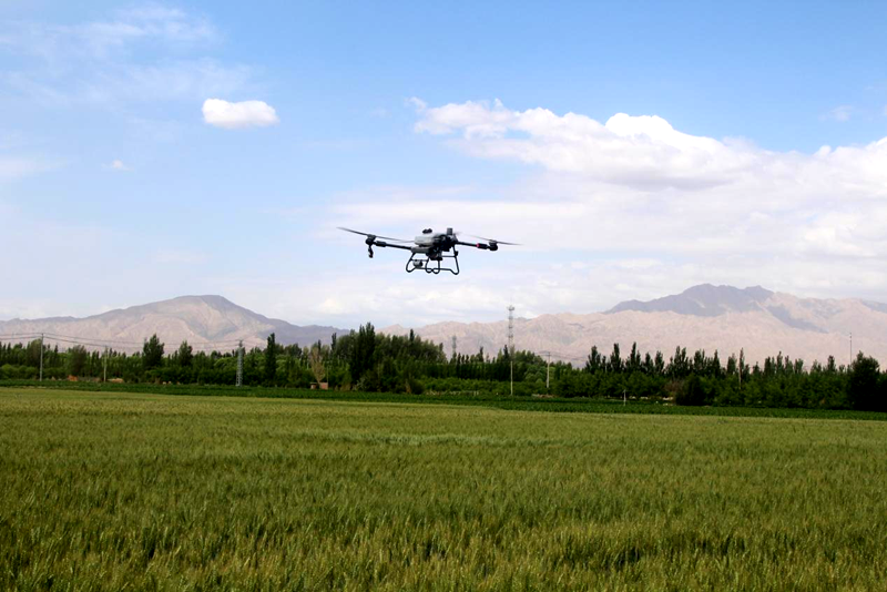 在沙河鎮西寨村連片100畝小麥淺埋滴灌示范點,滿載農藥的植保無人機在專業飛防技術人員的熟練操控下,來回穿梭,均勻地噴灑農藥,穩步開展植保作業。
