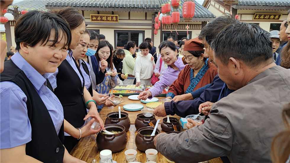 藝術(shù)節(jié)上,13個(gè)精心排演的歌舞表演令人目不給賞,掌聲、叫好聲此起彼伏,演職人員同觀眾互動(dòng)連連,將活動(dòng)氣氛推向一個(gè)又一個(gè)高潮。藝術(shù)節(jié)還特邀非遺美食傳承人現(xiàn)場(chǎng)制作山丹罐罐席和炒撥拉。罐罐席相傳誕生于隋煬帝在焉支山下會(huì)見西域二十七國(guó)使臣,以牛、羊、雞肉為主材,加入本地生長(zhǎng)的蘑菇、發(fā)菜、黃參等佐料燉煮而成。