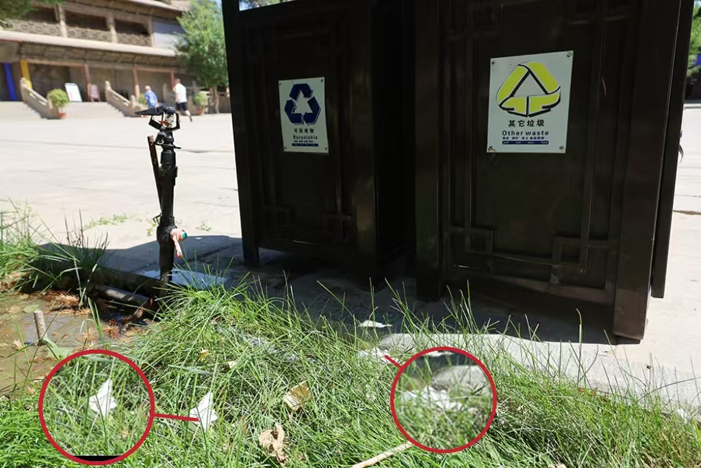 景區(qū)每隔一段距離都有固定的垃圾箱,上面還張貼著“垃圾分類保護(hù)環(huán)境”文明標(biāo)語,但垃圾仍丟在垃圾桶旁。