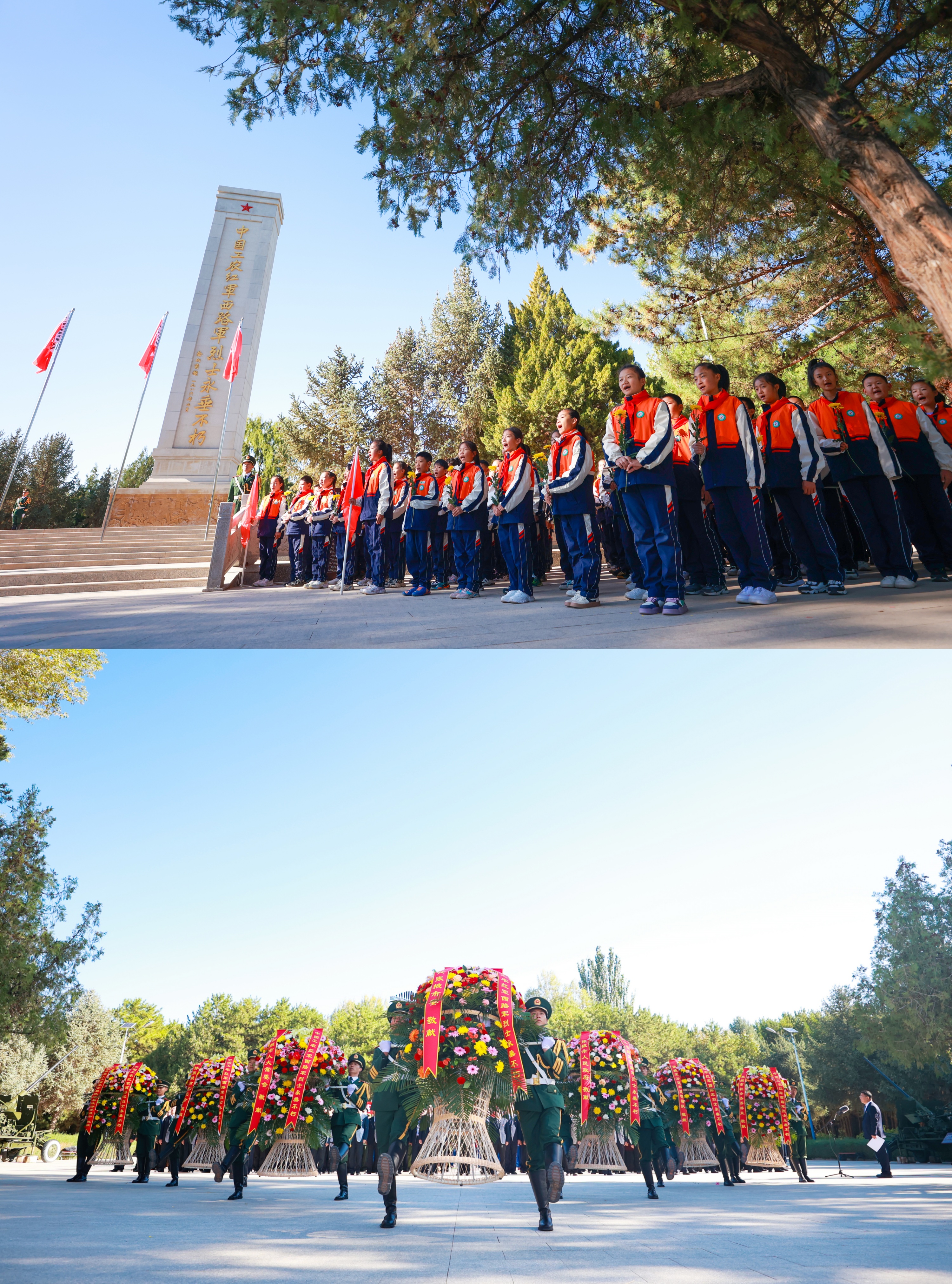 《獻(xiàn)花曲》緩緩奏響,14名武警戰(zhàn)士抬起花籃,緩緩走向紀(jì)念碑,將中共張掖市委、張掖市人大常委會(huì)、張掖市人民政府、政協(xié)張掖市委員會(huì)、張掖軍分區(qū)和武警部隊(duì)、臨澤縣委縣人大常委會(huì)縣政府縣政協(xié)、張掖市社會(huì)各界群眾敬獻(xiàn)的7個(gè)花籃擺放在紀(jì)念碑基座上。