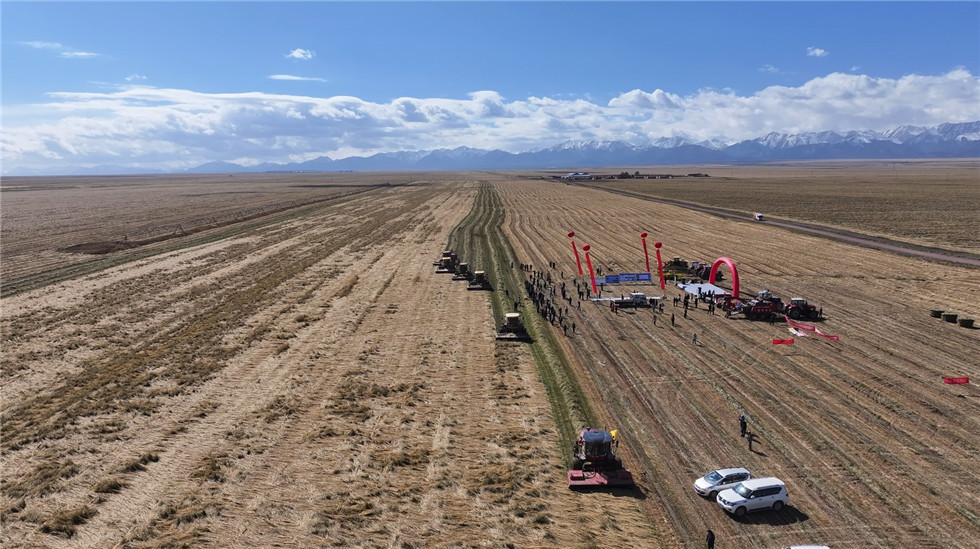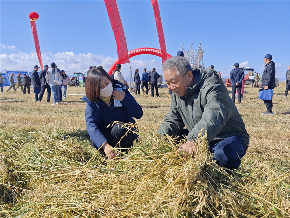 會議期間,與會人員赴中農發山丹馬場二場燕麥連片種植區現場觀摩燕麥收獲機械和燕麥收獲。