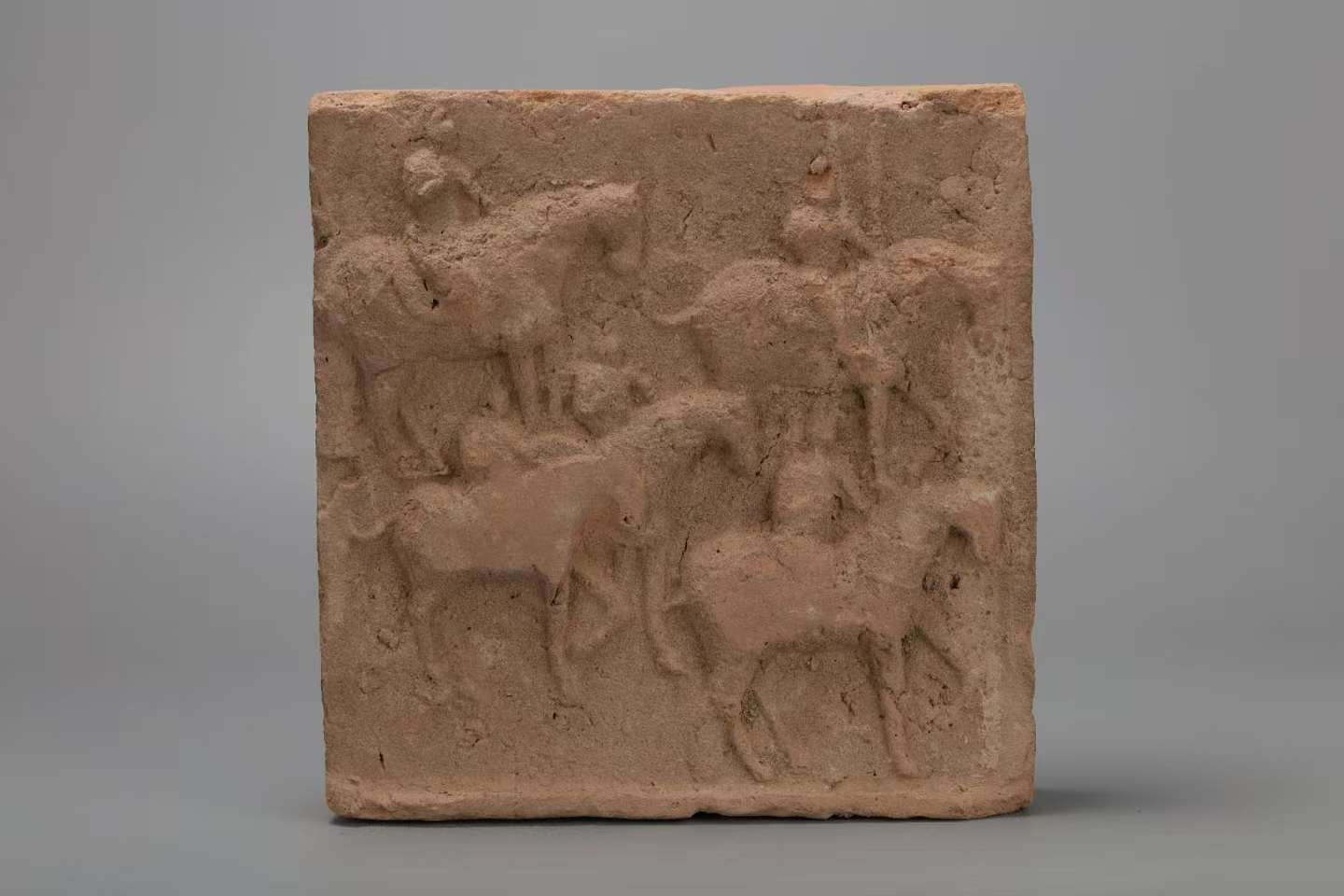模印騎馬武士圖墓磚和牽馬圖墓磚上刻畫的武士穿著服飾特征十分清晰,幞頭頂部高聳,窄袖胡服,呈現(xiàn)出很強的時代特色,雕刻的馬匹,馬首各具姿態(tài)、馬頸弧度優(yōu)美、胸肌健峻、臀部圓碩、腿蹄腱張,與武士相得益彰,使整個磚面充滿鮮活之氣。人和動物比例協(xié)調(diào),構(gòu)圖細(xì)膩,錯落有致,構(gòu)思巧妙,簡單的一幅圖案就把騎士們奔波于絲路,長途跋涉,風(fēng)塵仆仆的情景栩栩如生的刻畫了出來。