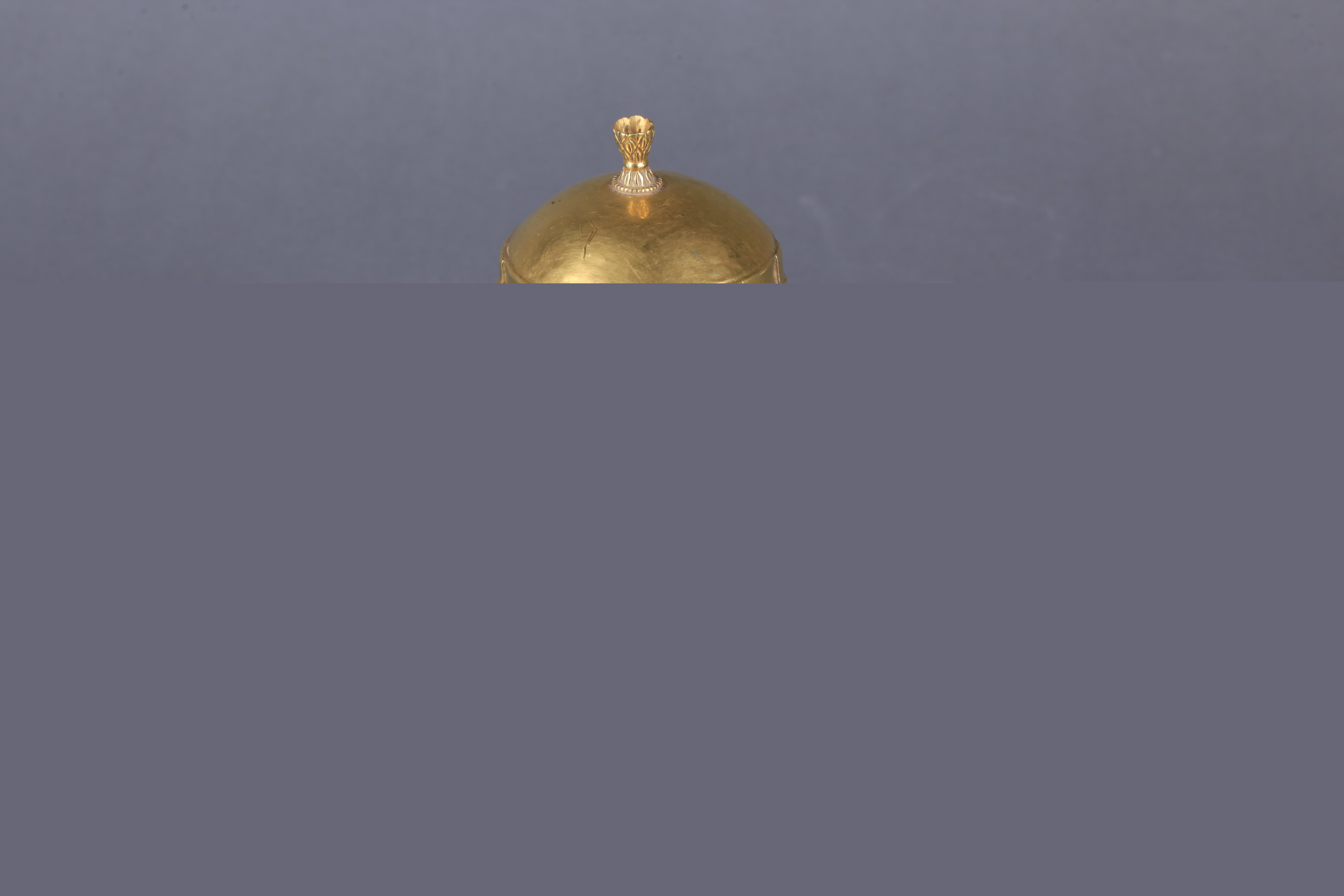 鑲綠松石金壺,侈口卷沿,高頸溜肩鼓腹,假高圈足,平底。半球形壺蓋,蓋頂中央有聯(lián)珠座束腰蓮紋捉鈕,鈕頂鑲珠已佚,直邊下包壺口。蓋與壺頸一側(cè)用活頁形鉚榫相連,可上下翻轉(zhuǎn),一側(cè)有扣舌可勾鎖封閉。壺肩部施凸弦紋一周,肩腹部鉚接一環(huán)形把,把上有花形指墊,墊中央鑲一圓形綠松石。有鮮明的中亞、粟特文化風(fēng)貌,充分彰顯了唐代能工巧匠在外來文化交流中不斷創(chuàng)造、豐富的精湛工藝,所加工成的藝術(shù)品精致華美、光彩奪目,有著永恒的價值和無窮的魅力。
