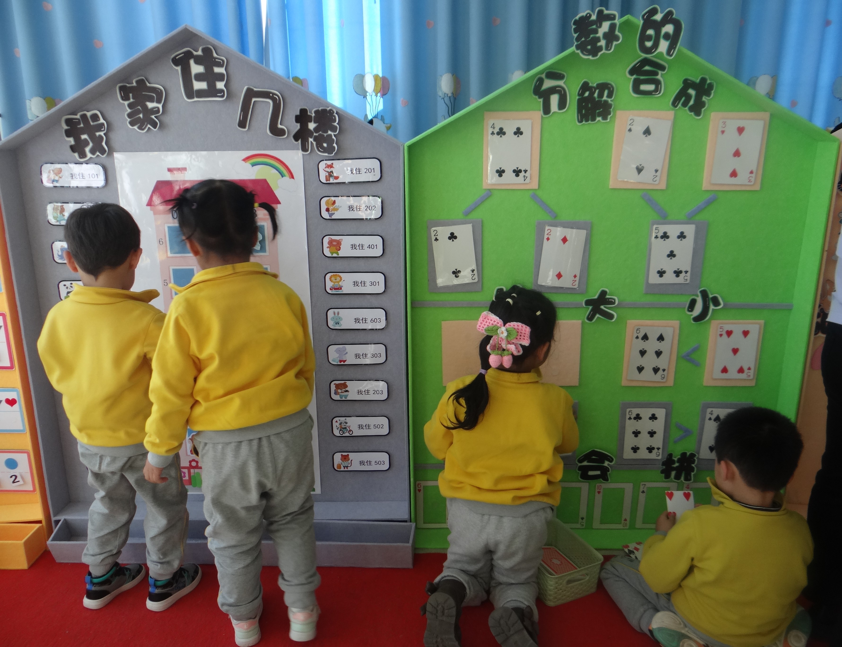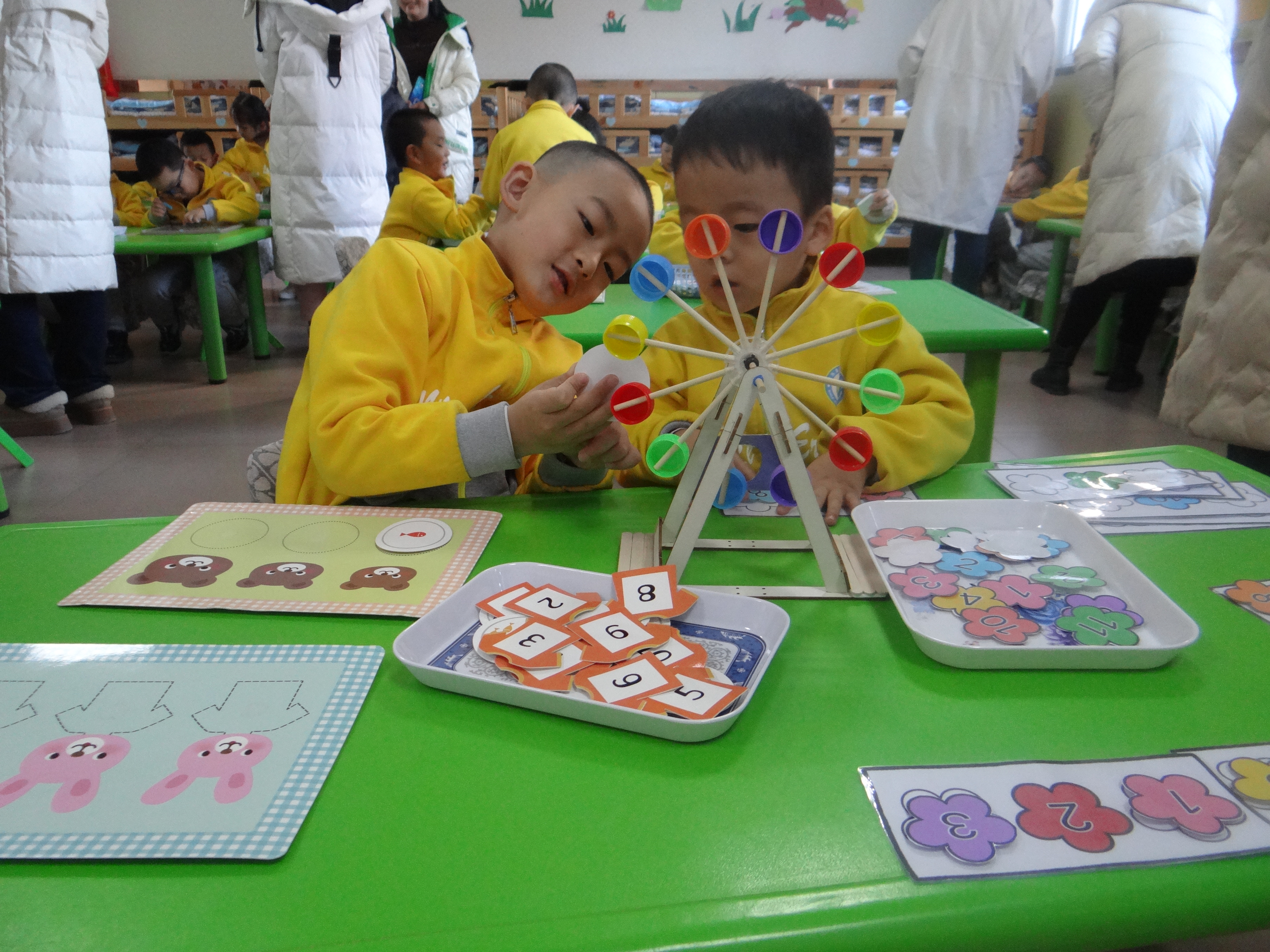 觀摩過程中,老師們帶著欣賞與學習的心態走進每個班級,對各班的數學區域環境的創設、操作材料的投放、教師的指導策略、游戲記錄形式等進行了觀摩學習,并認真聆聽各班老師對數學區域創設的講解。